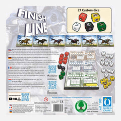 In Finish Line erlebt ihr den Nervenkitzel eines echten Pferderennens – kombiniert mit cleverem Würfelmanagement und spannenden Wettentscheidungen. Bevor das Rennen beginnt, werden die Pferde zufällig aufgestellt, wobei Favoriten und Sprinter ganz unterschiedliche Vorteile bieten (Startaufstellung auf Seite 3). Dann setzen alle Spieler geheim ihre Wetten: auf den Sieg einzelner Pferde oder auf die beiden Erstplatzierten.