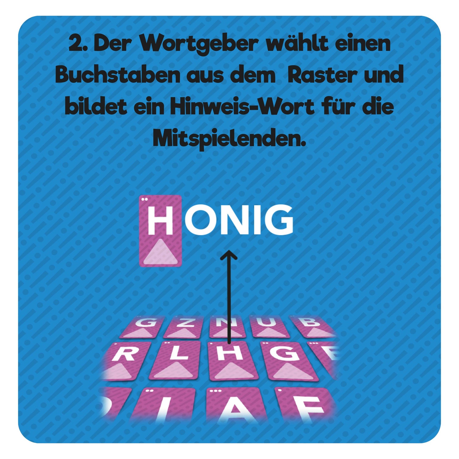 - Der Wortgeber sucht sich einen Buchstaben aus dem Buchstabenraster aus, bildet ein Hinweis-Wort und gibt es den Mitspielenden.
