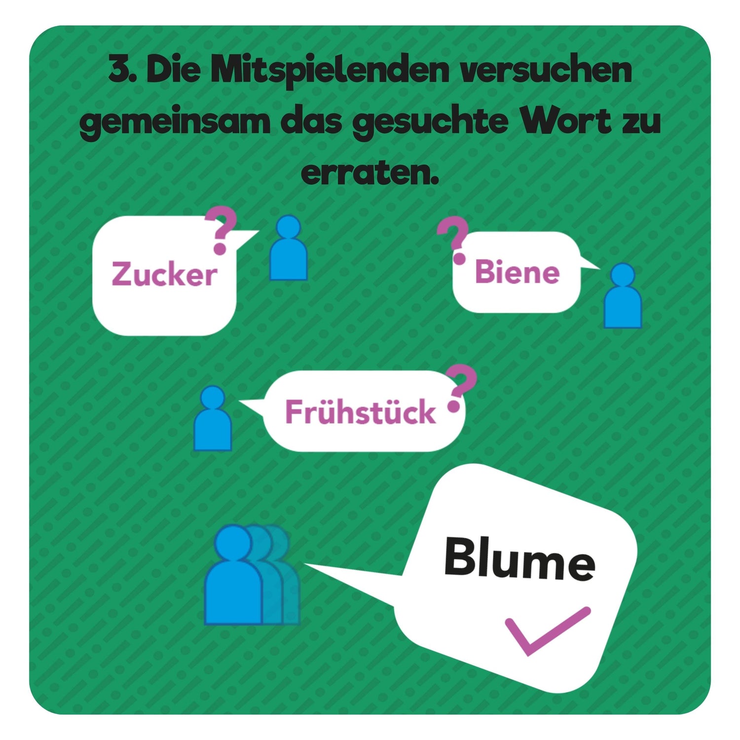 - Die Mitspielenden versuchen mit Hilfe des Hinweis-Worts das gesuchte Wort zu erraten.