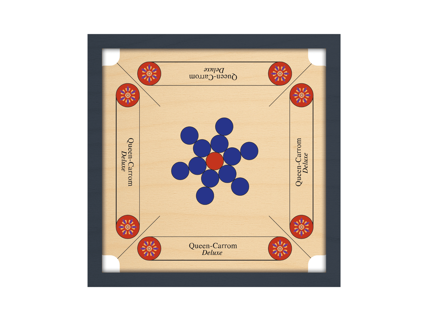 Mit Queen Carrom To Go bringst du ein traditionsreiches Geschicklichkeitsspiel mit modernen Varianten auf den Tisch.