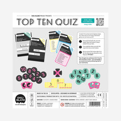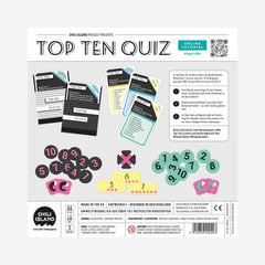 In Top Ten Quiz stellt ihr euer Wissen und eure Menschenkenntnis gleichermaßen auf die Probe. Zwei Teams treten gegeneinander an und müssen Top-Ten-Listen aus verschiedenen Wissensgebieten möglichst vollständig erraten. Doch bevor es losgeht, schätzt euer Captain ein, wie viele richtige Antworten das eigene Team wohl weiß – und bietet entsprechend mutig oder vorsichtig. Wer zu hoch pokert, riskiert wertvolle Punkte, wer clever bietet, kann mit Wissen und Taktik die Runde gewinnen. Mit Joker-Chips, Reiz-Varianten und spannenden Entscheidungen bleibt jede Partie abwechslungsreich und interaktiv. Einfach erklärt, schnell gespielt und ideal für Familien, Freundesrunden oder Partys – Top Ten Quiz ist das perfekte Spiel für alle, die Quizfragen lieben, aber mehr Spannung wollen als nur „richtig oder falsch“.